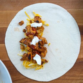 Assemble the wrap: Lay down a square of wax paper with a tortilla on top. Add in all remaining ingredients, then wrap up as tight as you can by tucking in the sides of the tortilla.